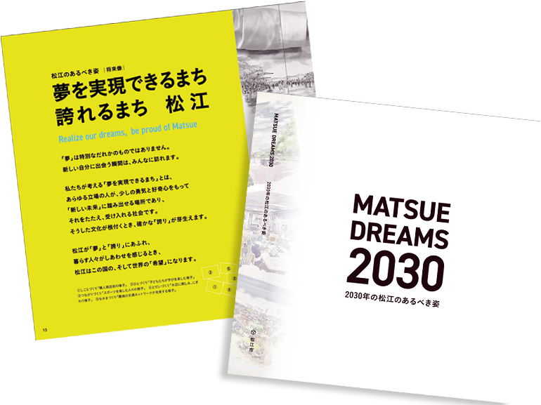 2022年3月に、2030年の松江がめざす姿をまとめた松江市総合計画「MATSUE DREAMS 2030」を策定しました。「夢を実現できるまち誇れるまち 松江」をめざし、力強く取組みを推進しています。